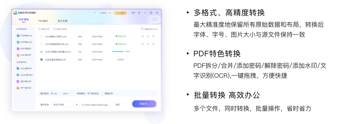 輕巧、方便、快捷、安全2345PDF轉(zhuǎn)換器,是一款功能強(qiáng)大、操作簡單的PDF轉(zhuǎn)換軟件,支持PDF文檔和Word、PPT、Excel、圖片等文檔多種格式之間的互轉(zhuǎn);同時支持PDF拆分、PDF合并、PDF添加和解除密碼、圖片處理以及OCR文字識別等功能。文件轉(zhuǎn)換格式豐富、轉(zhuǎn)換質(zhì)量好、產(chǎn)品界面操作便捷,是新一代文件格式轉(zhuǎn)換工具。 了解更多