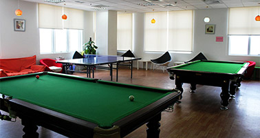 休閑中心公司在辦公區(qū)域設(shè)立了員工休閑中心,休閑中心內(nèi)有臺球桌、乒乓球桌、桌上足球等一系列玩樂設(shè)施,滿足了大家在午休和下班時間的休閑放松。