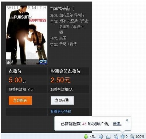 安裝完畢后,打開2345智能瀏覽器,其智能攔截的功能便自動開啟。此時,點擊某視頻網站并打開影片《當幸福來敲門》,瀏覽器右下角立刻彈出“已智能攔截45秒視頻廣告”的氣泡。不知不覺中,2345智能瀏覽器已為用戶省去了大量時間,以后每位電影達人都可以輕松看電影,再不受視頻廣告的騷擾了!