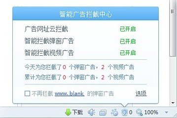 智能攔截中心為大家開啟廣告網址云攔截、彈窗廣告攔截和視頻廣告攔截的功能。用戶也可隨時查看被攔截的數量,并在“選項”中勾選所需的攔截功能。