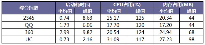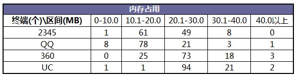 在內(nèi)存占用方面,由于UC和360內(nèi)存占用30M以上的機型比較多,拉高了整體數(shù)據(jù),所以對比結(jié)果中QQ占用內(nèi)存最少,2345次之,360隨后,UC最大。