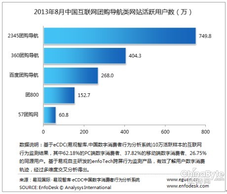 易觀智庫(kù)EDC近日發(fā)布2013年8月互聯(lián)網(wǎng)團(tuán)購(gòu)導(dǎo)航類網(wǎng)站活躍用戶數(shù)報(bào)告,報(bào)告顯示,2345團(tuán)購(gòu)導(dǎo)航以749.8萬(wàn)的活躍用戶位列第一,而360、百度團(tuán)購(gòu)導(dǎo)航則以404.3萬(wàn)和268.0萬(wàn)的活躍量位居二、三位,近期發(fā)展迅猛的團(tuán)800和57團(tuán)購(gòu)網(wǎng)則分列第四和第五位。
