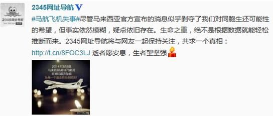 此外,網(wǎng)站右側(cè)醒目的馬航MH370專題依舊在保持最新消息的實(shí)時(shí)更新。2345網(wǎng)址導(dǎo)航官方微博今日將頭像換為灰色,并發(fā)布微博表示:“盡管馬來(lái)西亞官方宣布的消息似乎剝奪了我們對(duì)同胞生還可能性的希望,但事實(shí)依然模糊,疑點(diǎn)依舊存在。生命之重,絕不是根據(jù)數(shù)據(jù)就能輕松推斷而來(lái)。2345網(wǎng)址導(dǎo)航將與網(wǎng)友一起保持關(guān)注,共求一個(gè)真相。”