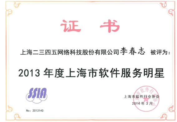 2014年3月26日下午,上海市軟件行業(yè)協(xié)會(huì)2014年工作年會(huì)暨“上海市軟件行業(yè)標(biāo)兵&軟件行業(yè)服務(wù)明星”評(píng)選活動(dòng)頒獎(jiǎng)典禮在上海市經(jīng)濟(jì)管理干部學(xué)院禮堂舉行。上海市經(jīng)信委、科委、發(fā)改委、商務(wù)委等相關(guān)部門負(fù)責(zé)人,相關(guān)產(chǎn)業(yè)園區(qū)(基地)、行業(yè)協(xié)會(huì)、軟件企業(yè)負(fù)責(zé)人及十余家媒體記者,約300人到會(huì)。本次評(píng)選活動(dòng)中二三四五董事長龐升東獲得軟件行業(yè)標(biāo)兵稱號(hào),二三四五軟件研發(fā)中心李春志獲得軟件服務(wù)明星稱號(hào)。