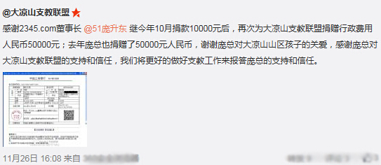 日前,公益微博賬號“@大涼山支教聯(lián)盟”發(fā)布圖文信息對2345.com董事長龐升東捐贈善款表示感謝。博文中更是提及,龐升東以連續(xù)兩年多次對該機構進行扶助。細心網(wǎng)友注意到,同一時期,龐升東的名字也在其他十余家支教組織的捐款公示中出現(xiàn)。據(jù)不完全統(tǒng)計,龐升東近期累計資助12家支教組織,善款總額高達83萬元。