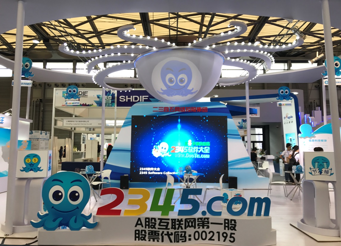 展臺(tái)的設(shè)計(jì)體現(xiàn)著企業(yè)的個(gè)性。此次二三四五的展臺(tái)布置,不僅延續(xù)了往年的展示風(fēng)格——品牌形象“章魚寶寶”的創(chuàng)意衍生表現(xiàn)形式,更是融入了別出心裁的夢(mèng)幻燈光秀?,F(xiàn)場(chǎng)搭建了一只巨大的章魚吊頂,藍(lán)白相間的氛圍燈聚焦于章魚Logo,輔以百足觸手燈相間點(diǎn)綴,再有水紋燈在地板上映射出水波粼粼的效果,整個(gè)展臺(tái)都籠罩在“2345藍(lán)”的海洋般的氛圍里。