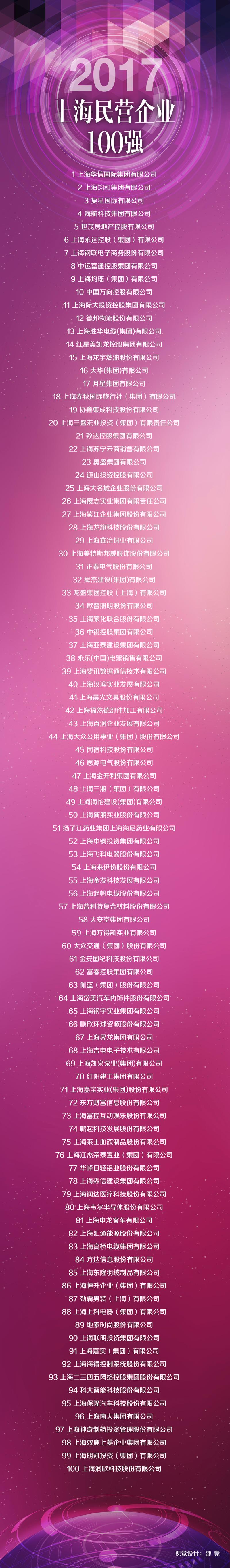 8月28日,由上海市企業(yè)聯(lián)合會、上海市企業(yè)家協(xié)會、上海市經(jīng)濟團體聯(lián)合會聯(lián)合發(fā)布了2017上海企業(yè)百強榜。上海二三四五網(wǎng)絡控股集團股份有限公司(簡稱“二三四五”,股票代碼002195)榮登“上海民營企業(yè)100強”第93位, 成為上海本土互聯(lián)網(wǎng)企業(yè)備受矚目的中堅力量。