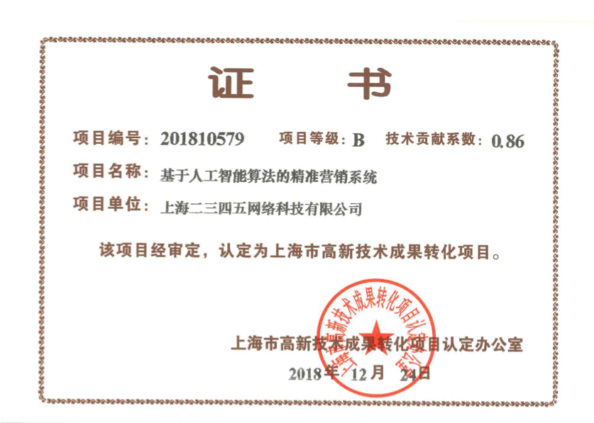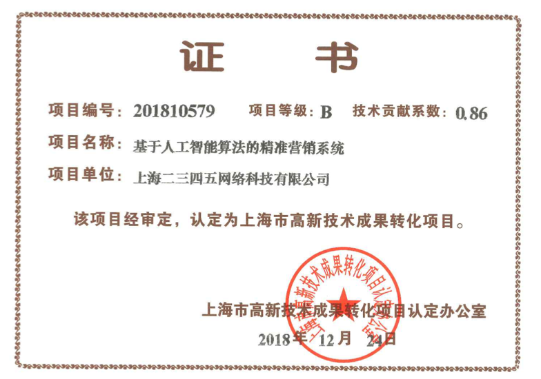 據(jù)悉,這已經(jīng)不是二三四五第一次獲得高新技術(shù)成果轉(zhuǎn)化認(rèn)證,這充分體現(xiàn)出二三四五的科技研發(fā)實(shí)力與技術(shù)轉(zhuǎn)化能力。