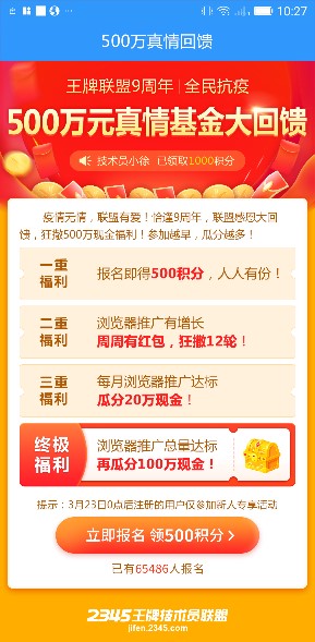 隨著國內(nèi)新冠疫情逐步緩解,不少省市已經(jīng)降低重大突發(fā)公共衛(wèi)生事件影響等級,大力推進復(fù)工復(fù)產(chǎn)有序進行,讓社會經(jīng)濟發(fā)展和人們生活逐步回歸正軌。2345王牌技術(shù)員聯(lián)盟恰逢9周年之際,于3月30日零點上線500萬抗疫真情基金大回饋活動,通過現(xiàn)金福利的活動形式,激發(fā)技術(shù)員們復(fù)工復(fù)產(chǎn)的工作熱情,并對疫情期間辛勤勞作的技術(shù)員進行獎勵。