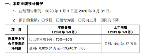 4月11日,二三四五(002195)近日發(fā)布2019年第一季度預(yù)告,公告顯示,2020年1月1日至2020年3月31日,公司盈利:8,826.87萬(wàn)元-13,240.31萬(wàn)元,比上年同期下降:70%-80%。