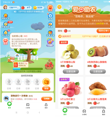以最受用戶歡迎的核心助農(nóng)游戲產(chǎn)品 “星球果園”為例,“星球果園”是一款典型的虛擬農(nóng)場產(chǎn)品,用戶通過在產(chǎn)品頁面種下樹苗后,完成平臺制定的相應(yīng)“小任務(wù)”,如每天簽到、給寵物喂食、瀏覽指定頁面、看新聞、看視頻等方式,即可獲得不等量的水滴獎勵,并用水滴澆灌樹苗,使其成長為果樹,完成任務(wù)后最終可免費兌換實物水果,平臺包郵送到家。
