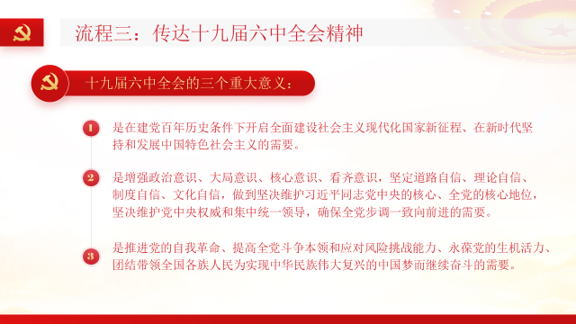 會議流程三,向各位黨員傳達黨的十九屆六中全會精神,強調十九屆六中全會召開的重大意義。號召各位黨員貫徹并落實“兩個維護”的重要內容,即“堅決維護習近平同志黨中央的核心、全黨的核心地位,堅決維護黨中央權威和集中統(tǒng)一領導”。