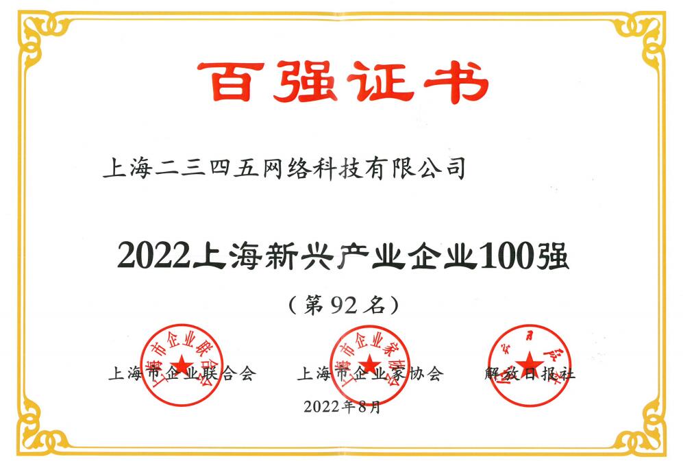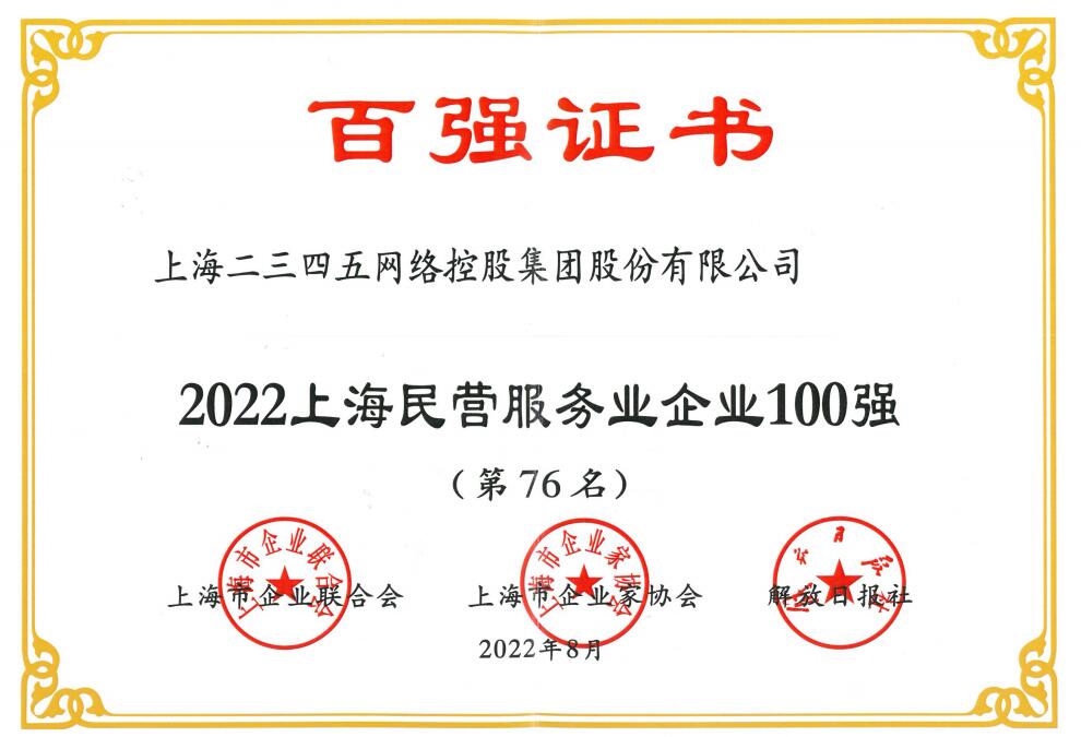 2022年8月30日下午,上海市企業(yè)聯(lián)合會(huì)、上海市企業(yè)家協(xié)會(huì)、上海市經(jīng)濟(jì)團(tuán)體聯(lián)合會(huì)和解放日報(bào)社聯(lián)合召開2022上海百強(qiáng)企業(yè)新聞發(fā)布會(huì)。上海二三四五網(wǎng)絡(luò)控股集團(tuán)股份有限公司榮登“上海民營服務(wù)業(yè)企業(yè)百強(qiáng)”,位列76名;上海二三四五網(wǎng)絡(luò)科技有限公司榮登“上海新興產(chǎn)業(yè)企業(yè)百強(qiáng)”,位列92位。