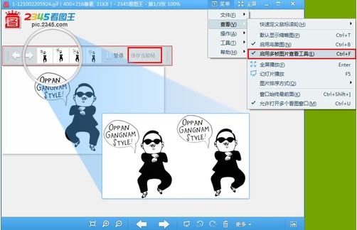 首先,獨(dú)有的多幀圖片查看工具支持GIF等多幀圖片的播放與單幀保存。最近十分流行鳥叔的江南STYLE騎馬舞步,用2345看圖王可以快速瀏覽學(xué)習(xí)每一個動作,讓自己時刻處于時尚潮流的前端。
