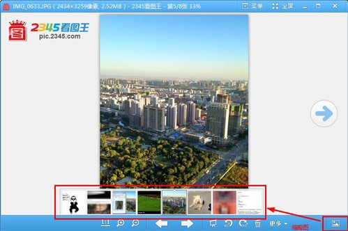 其次,2345看圖王擁有縮略圖功能,點(diǎn)擊看圖窗口右下角“縮略圖”按鈕,顯示縮略圖欄??s略圖欄顯示內(nèi)容是當(dāng)前圖片所在文件夾中的所有圖片。在鼠標(biāo)滾輪功能設(shè)置為圖像縮放情況下,當(dāng)鼠標(biāo)指針在縮略圖欄區(qū)域內(nèi),我們可以通過鼠標(biāo)滾輪進(jìn)行翻頁;而當(dāng)鼠標(biāo)指針在非縮略圖欄區(qū)域內(nèi),鼠標(biāo)滾輪的功能就變成放大縮?。ㄈ鐖D3)。我們可以在快速瀏覽圖片的同時,關(guān)注圖片的每一個細(xì)節(jié),讓瀏覽圖片更高效。